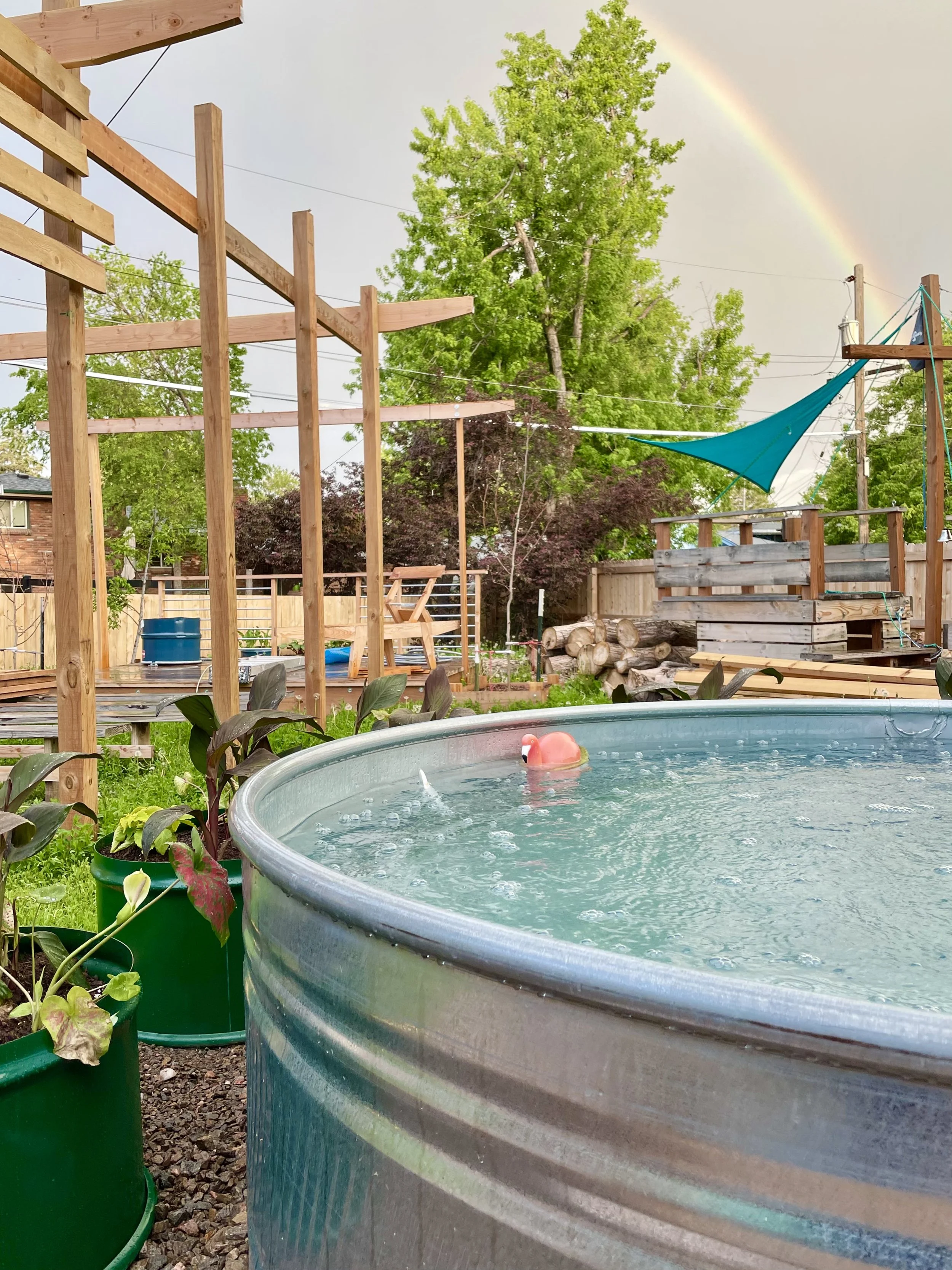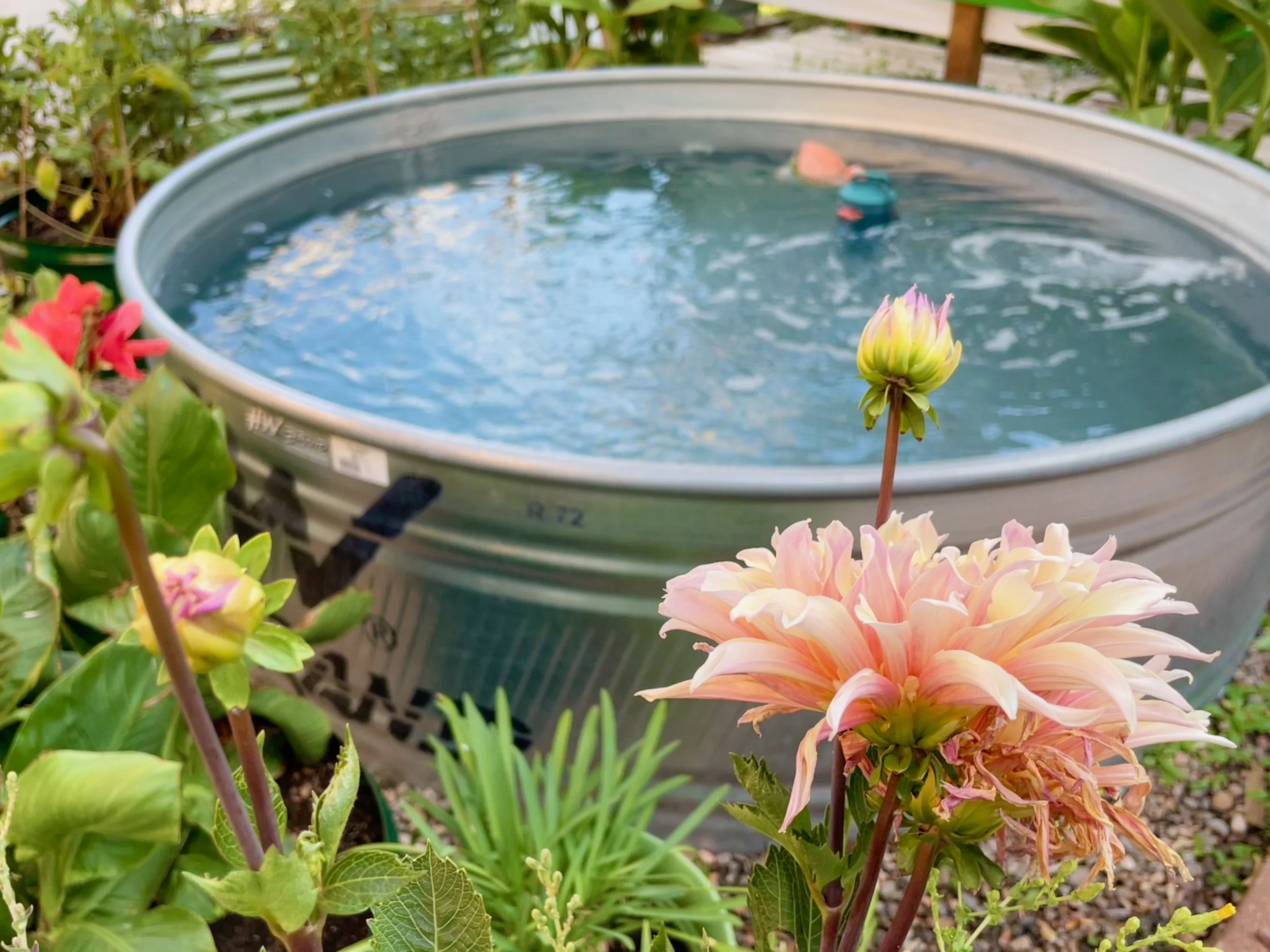 Stock tanks come in a range of sizes and shapes. We ended up with a round tank that is 7’ in diameter. But they come smaller, larger, and in oblong shapes, too. For reference, our tank easily holds two adults and a child with room to play. Our tank is 2’ deep — that’s pretty standard — and we can sit comfortably with our heads out of the water. But the water is absolutely deep enough for fun play!