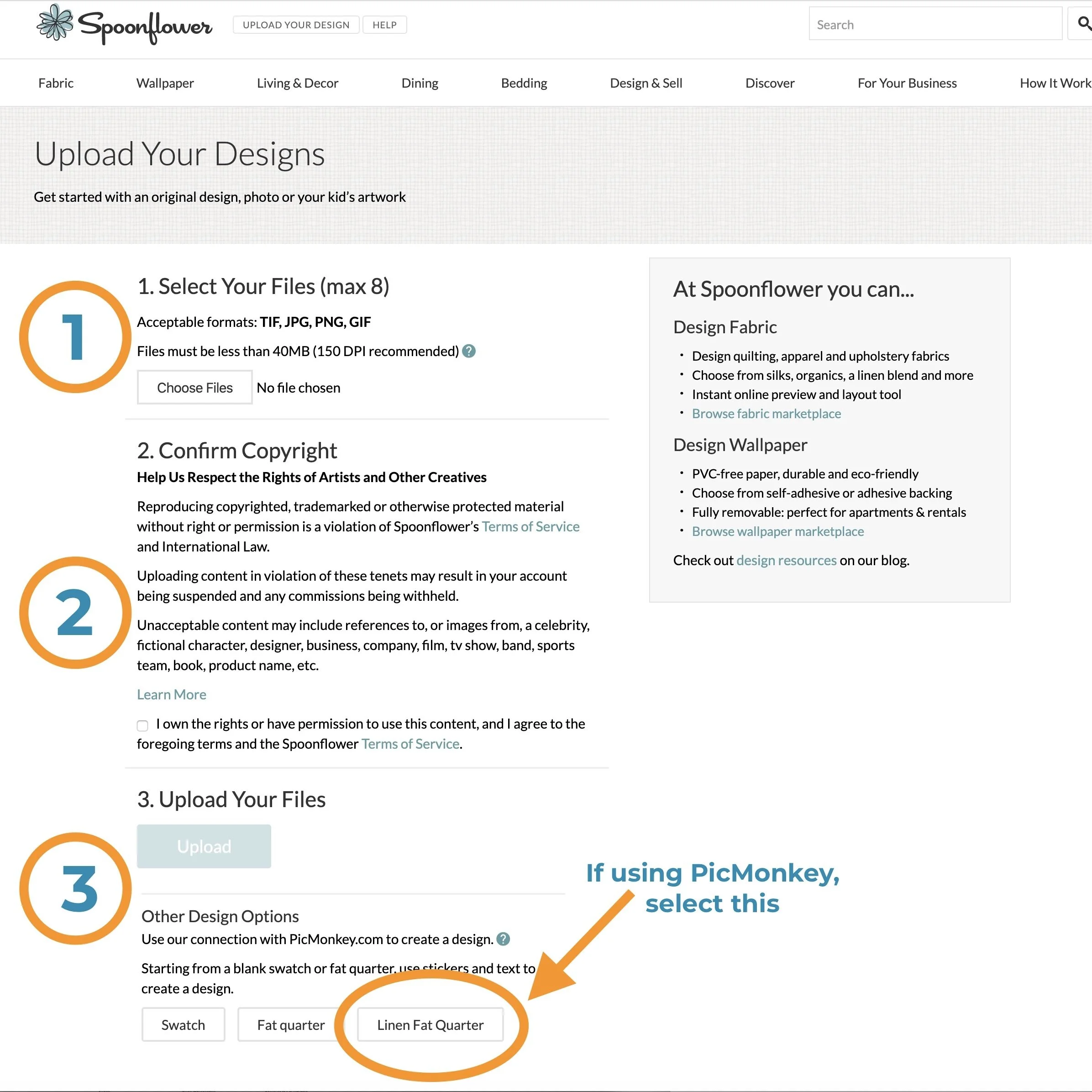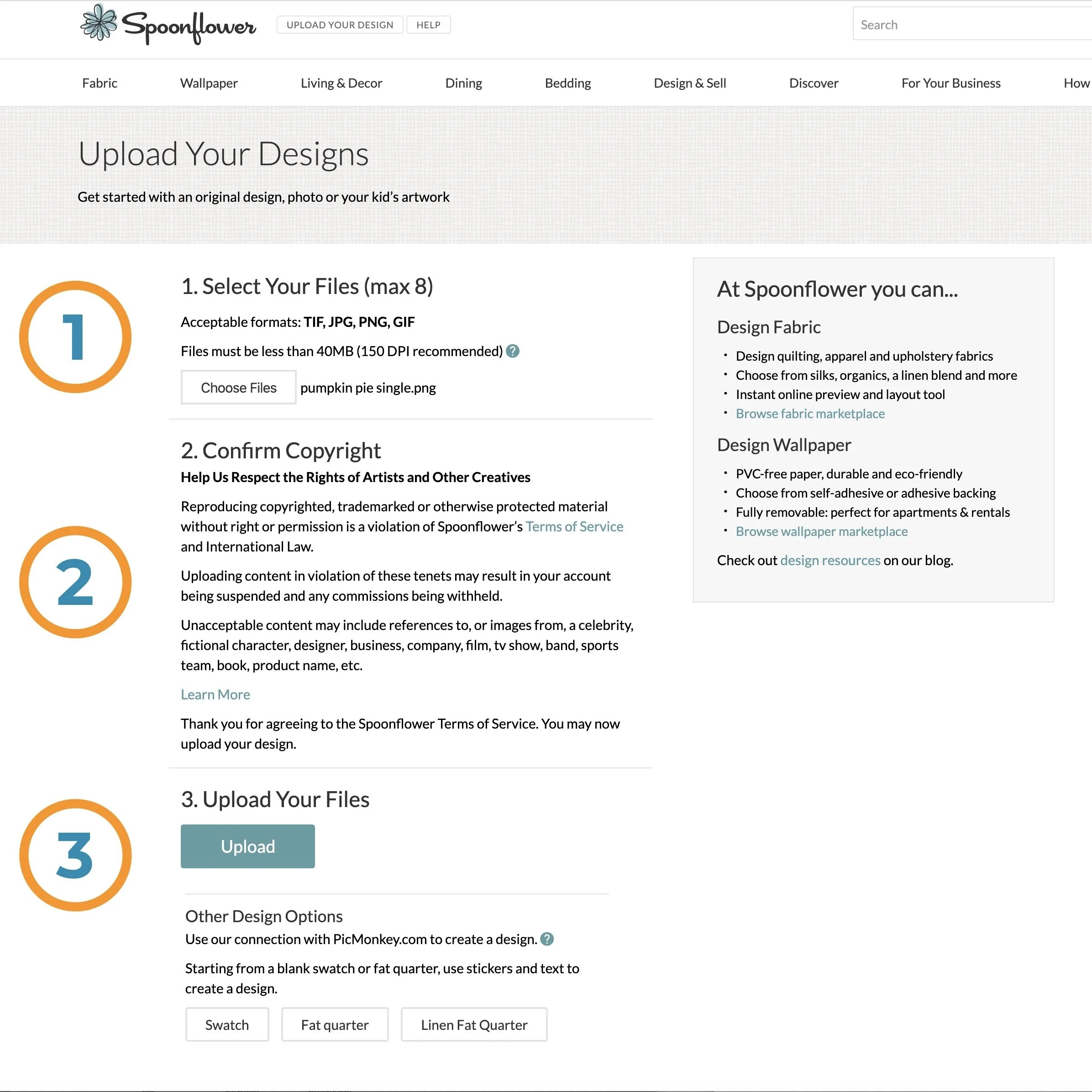 Go to the Spoonflower website and click Design & Sell -> Upload Your Design.